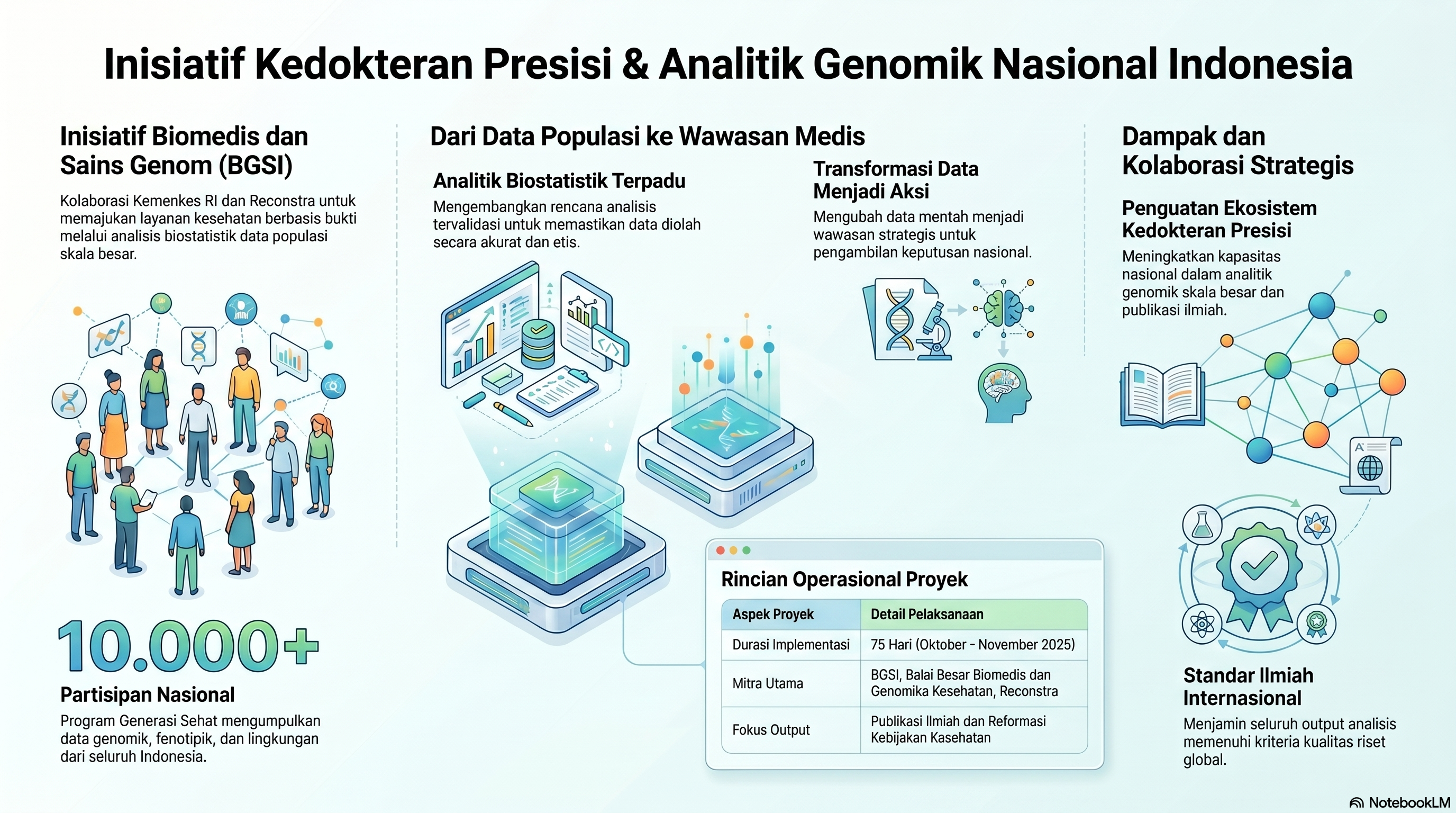 Proyek Konsultan Biostatistik untuk Analisis Agregat mendukung agenda nasional kedokteran presisi Indonesia melalui Biomedical and Genome Science Initiative (BGSI), yang diluncurkan oleh Kementerian Kesehatan Republik Indonesia pada tahun 2022. Berdasarkan keberhasilan perekrutan 10.000 partisipan, inisiatif ini kemudian diperluas melalui Program Generasi Sehat, yang mengumpulkan data genomik, fenotipik, dan lingkungan dari masyarakat umum di seluruh Indonesia. Program ini menjadi langkah strategis dalam mendorong layanan kesehatan berbasis bukti, riset genomik, serta kebijakan kesehatan yang lebih tepat sasaran.