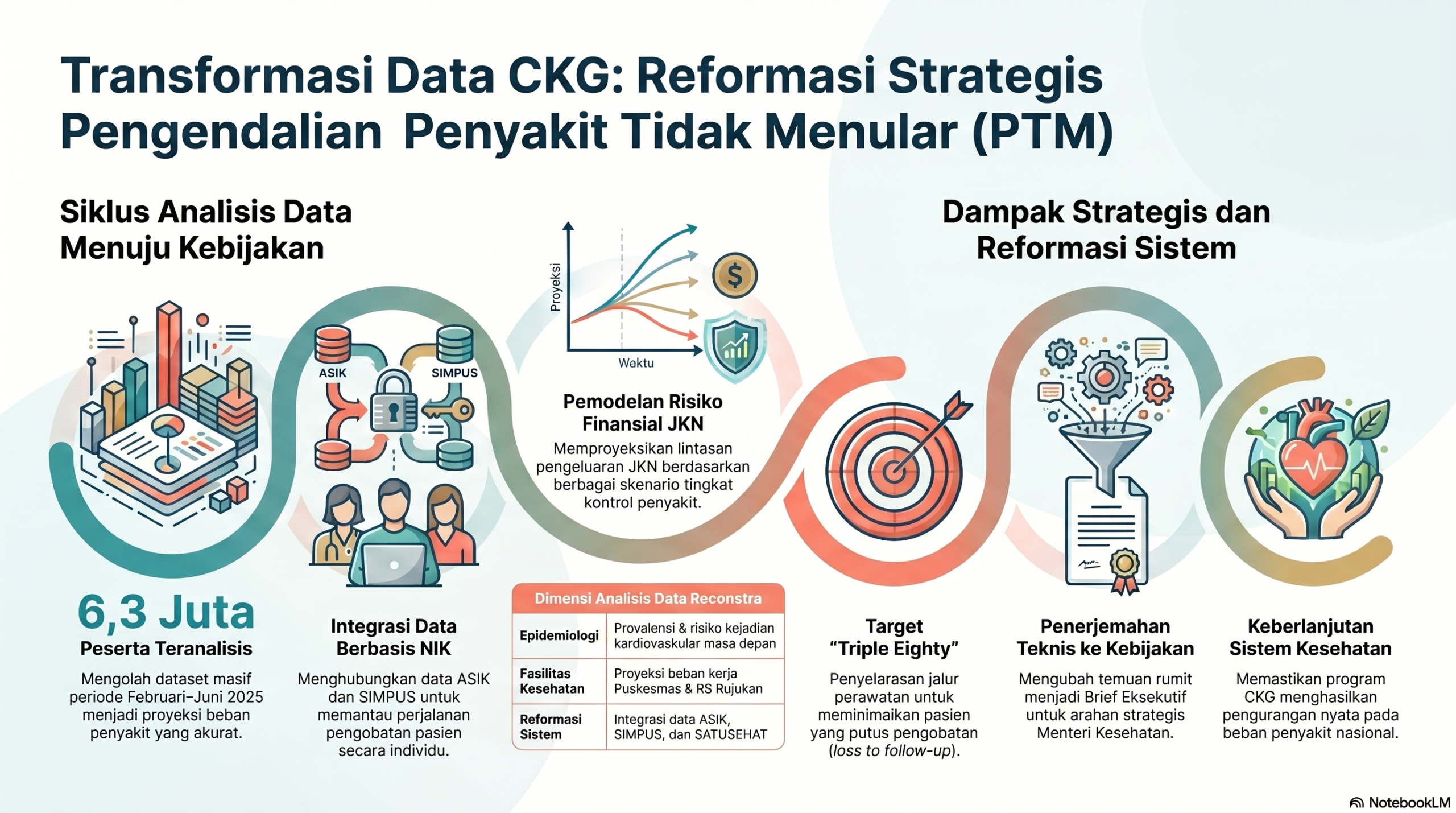 Proyek “Health Check, Health Talk: Leveraging CKG Data for Strategic Communication and Program Planning” dirancang untuk mentransformasikan data Cek Kesehatan Gratis (CKG) menjadi intelijen kebijakan yang dapat ditindaklanjuti guna menjawab peningkatan beban penyakit kardiovaskular (CVD) di Indonesia. Tujuan utama proyek ini adalah mendukung Kementerian Kesehatan dalam memanfaatkan data skrining secara real-time untuk mengarahkan strategi pencegahan, memperkuat sistem tindak lanjut layanan, serta mengantisipasi implikasi pembiayaan kesehatan dalam skema JKN. Dengan fokus pada hipertensi, diabetes, dan obesitas sentral, proyek ini bertujuan menjadikan CKG bukan sekadar program skrining, tetapi instrumen strategis untuk intervensi dini dan pengendalian biaya jangka panjang.