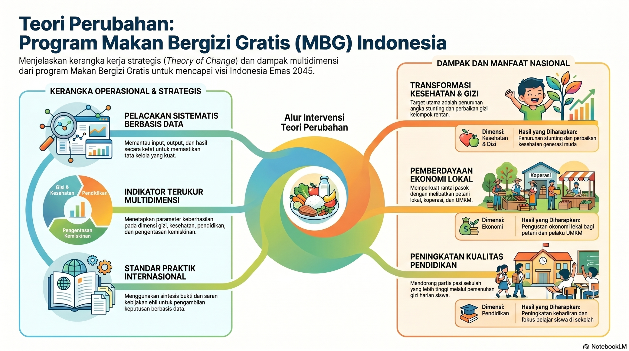 Pengembangan Theory of Change untuk Pemantauan dan Evaluasi Program Makan Bergizi Gratis (MBG) merupakan inisiatif strategis yang dirancang untuk memperkuat salah satu program prioritas nasional Indonesia dalam mengatasi malnutrisi, menurunkan stunting, dan membangun generasi sehat menuju Indonesia Emas 2045. Program ini diinisiasi di bawah kepemimpinan Prabowo Subianto dan dikoordinasikan oleh Badan Gizi Nasional. Program MBG bertujuan meningkatkan status gizi masyarakat sekaligus memberikan manfaat pada sektor pendidikan, pengentasan kemiskinan, dan pertumbuhan ekonomi lokal.