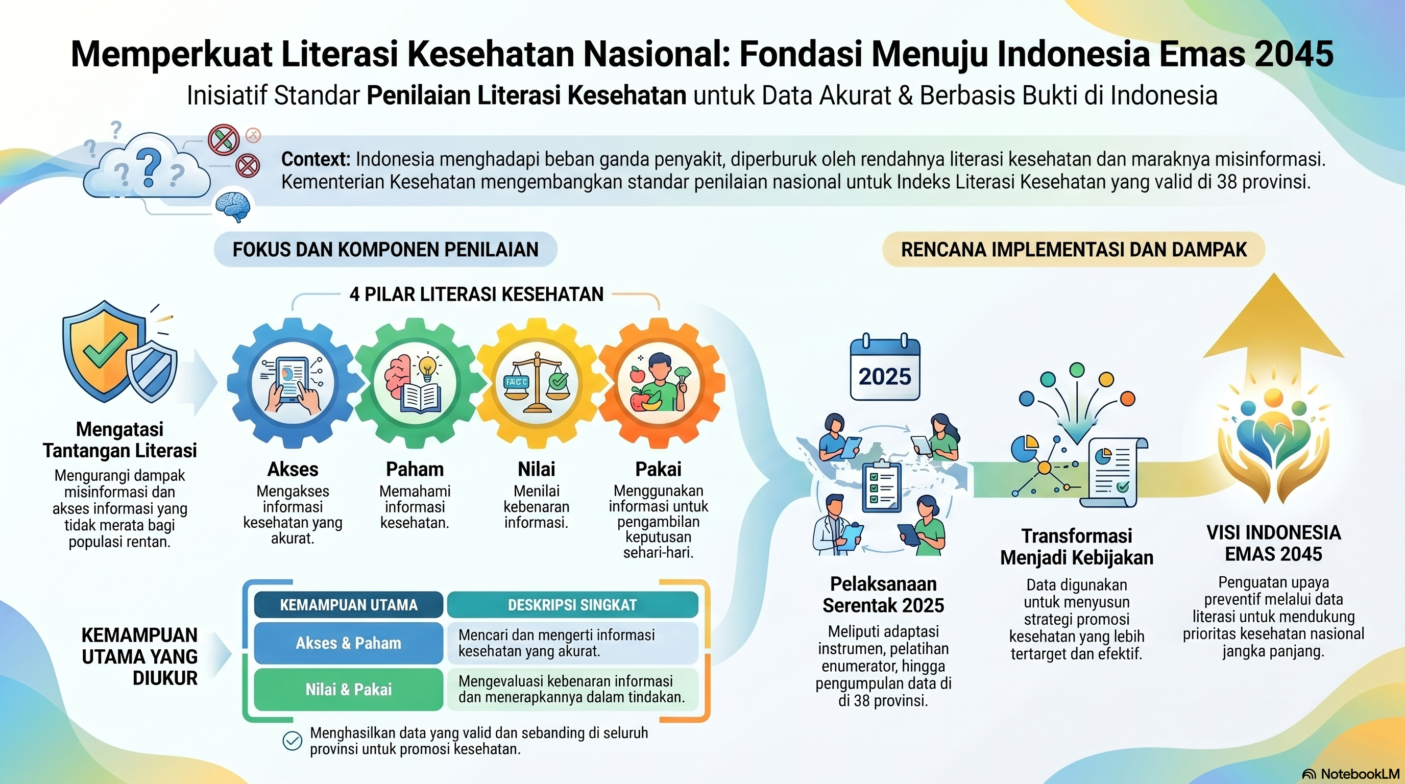 Indonesia terus menghadapi beban ganda penyakit, ditandai dengan meningkatnya penyakit tidak menular serta masih tingginya risiko penyakit menular. Tantangan ini diperburuk oleh rendahnya tingkat literasi kesehatan, ketimpangan akses terhadap informasi yang akurat, serta maraknya misinformasi, terutama di kelompok rentan. Untuk menjawab kebutuhan tersebut, Kementerian Kesehatan dan Reconstra mengembangkan Standar Penilaian Literasi Kesehatan di Indonesia, sebuah kerangka nasional untuk menghasilkan data literasi kesehatan yang valid, terstandar, dan dapat dibandingkan antarwilayah.