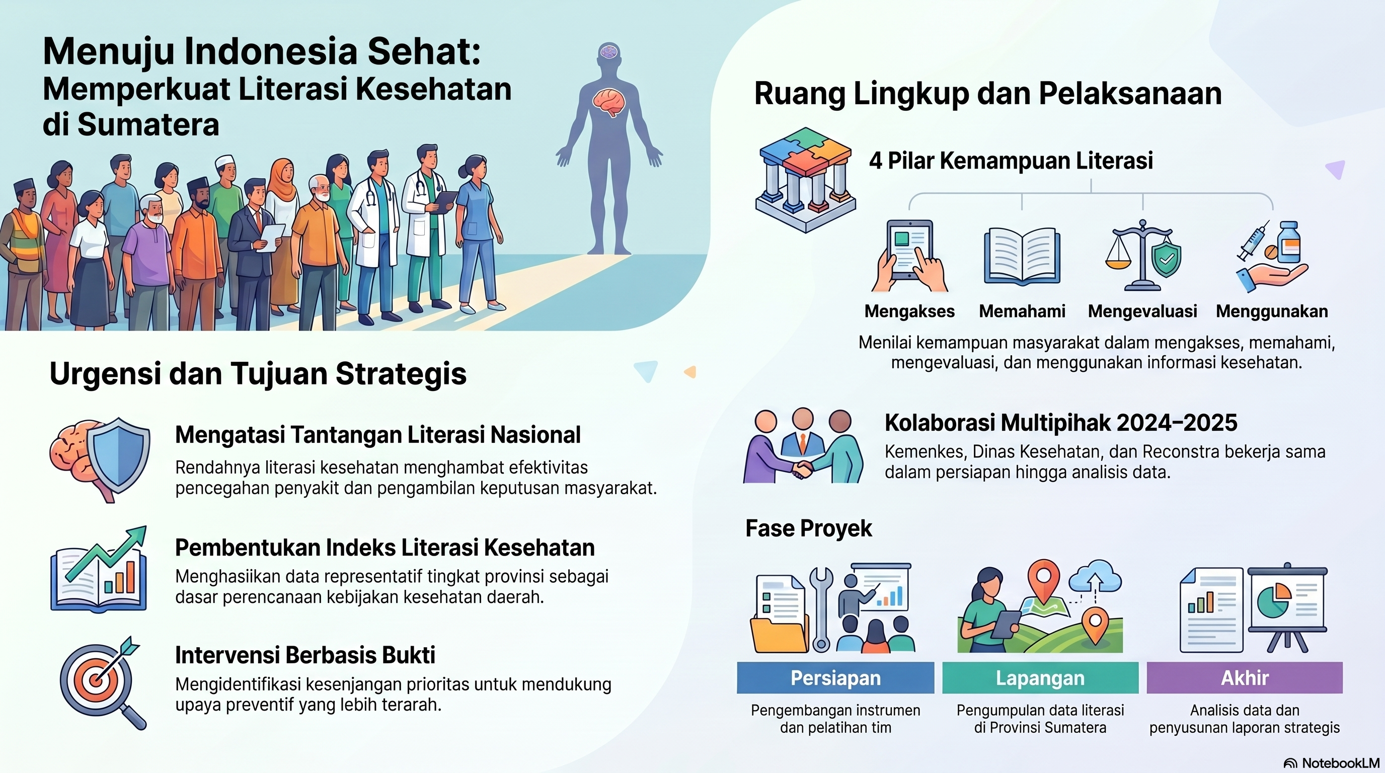 Indonesia terus menghadapi berbagai tantangan kesehatan masyarakat yang dipengaruhi oleh rendahnya literasi kesehatan, ketimpangan akses terhadap informasi yang kredibel, serta hambatan perilaku yang mengurangi efektivitas upaya pencegahan penyakit dan pengambilan keputusan sehat. Sebagai respons, Pemerintah Indonesia telah mengembangkan Standar Literasi Kesehatan Nasional dan memulai asesmen di tingkat provinsi untuk menghasilkan data yang akurat, representatif, dan dapat ditindaklanjuti. Proyek ini—dengan fokus di Provinsi Sumatera—bertujuan mendukung pelaksanaan Survei Literasi Kesehatan guna memperkuat promosi kesehatan berbasis bukti dan menjadi dasar perumusan kebijakan di masa mendatang.