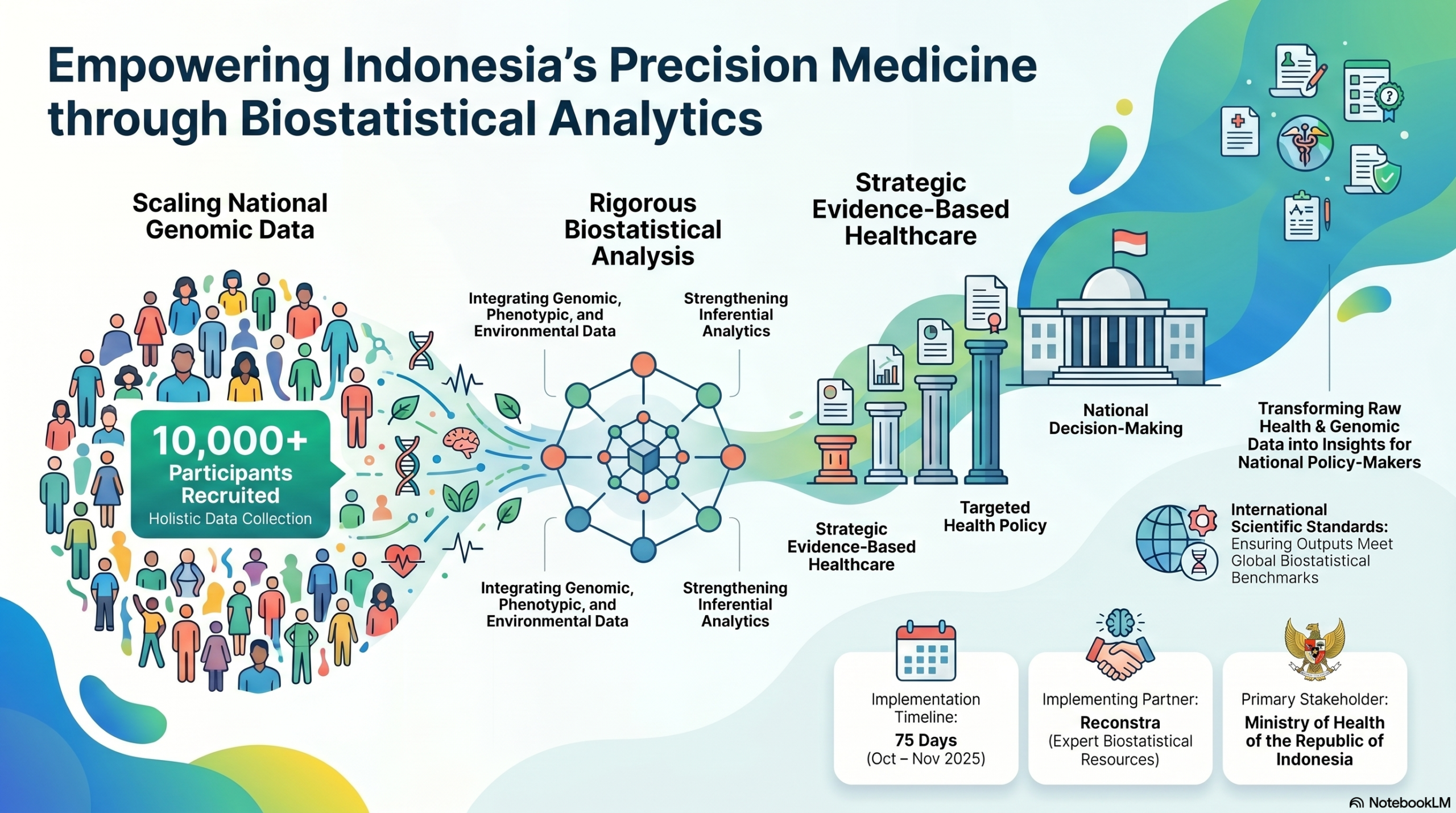 The Biostatistics Consultant for Aggregate Analysis project supports Indonesia’s national precision medicine agenda under the Biomedical and Genome Science Initiative (BGSI), launched by Ministry of Health of the Republic of Indonesia in 2022. Building on the successful recruitment of 10,000 participants, the initiative has expanded through the Generasi Sehat Program, which collects genomic, phenotypic, and environmental data from the general population across Indonesia. This marks a strategic step toward advancing evidence-based healthcare, genomic research, and targeted health policy.